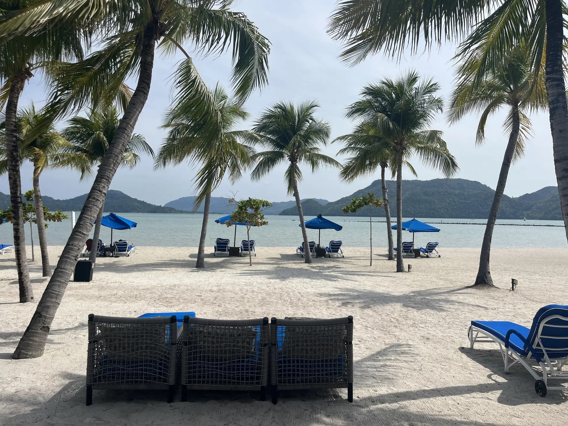 The beach at the St. Regis Langkawi is truly a dream beach. It offers everything you can imagine – white sand, palm trees and a view of a sea framed by greenery.